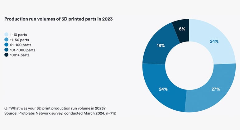 Production run volumes of 3D printed parts in 2023. Image via Protolabs.